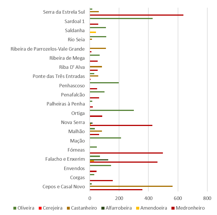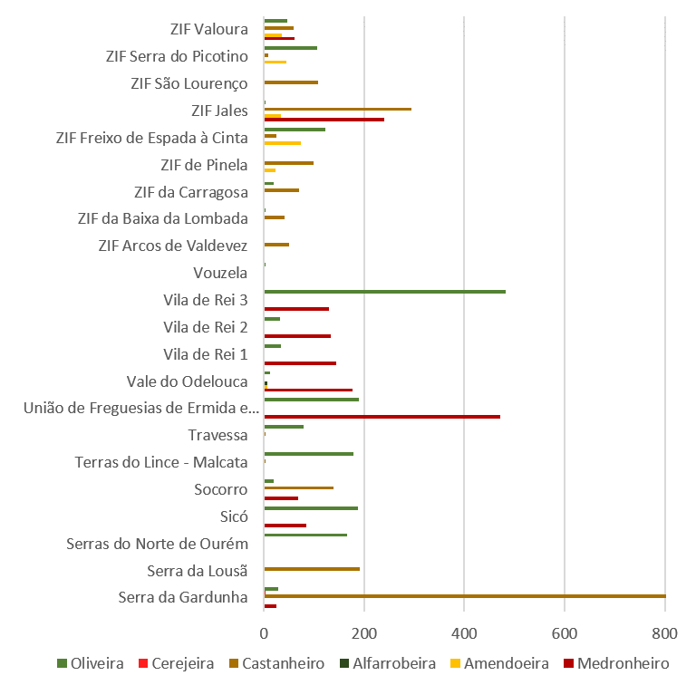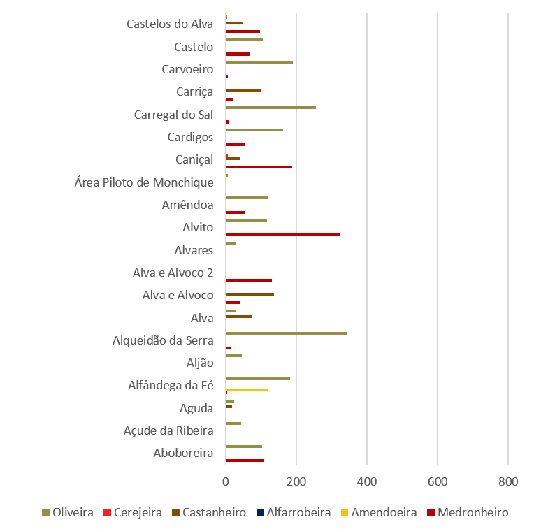 De forma geral, a distribuição das espécies revela-se diferenciada e ajustada aos diferentes contextos territoriais, evidenciando a adequação às condições ecológicas, climáticas e socioeconómicas de cada área de intervenção. Verifica-se a presença de espécies como a oliveira, o medronheiro, o castanheiro, a amendoeira, a alfarrobeira e a cerejeira com expressão variável nas diversas OIGP, em função das vocações e contextos locais. Estas espécies encontram-se distribuídas por OIGP localizadas no Norte, Centro e Sul do país, abrangendo diferentes tipologias territoriais, desde contextos de maior altitude a áreas do interior e territórios com distintas influências climáticas e ecológicas. No seu conjunto, esta diversidade contribui para a consolidação de sistemas produtivos multifuncionais, compatíveis com a gestão ativa da paisagem, a redução do risco de incêndio rural e a valorização económica dos territórios.