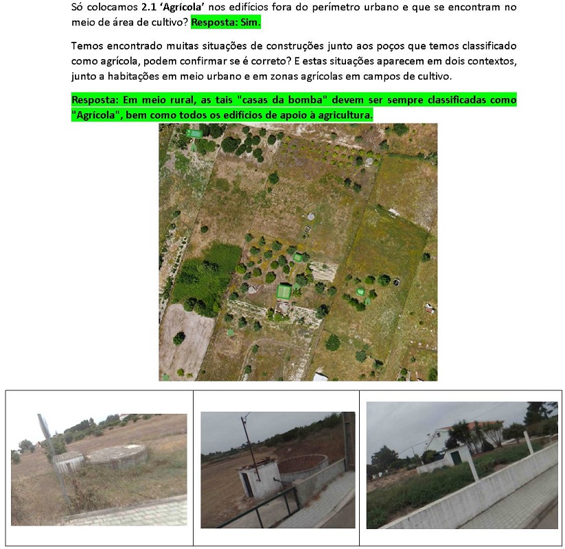 | Um edifício pode ser constituído por várias águas com alturas distintas, que devem estar todas incluídas num ÚNICO polígono, cujo valor contido no atributo alturaEdificio corresponde ao que está definido no atributo "valorElementoEdificioZ". Relativamente ao(s) valorUtilizacaoAtual que está/estão em tabelas de ligação, os edifícios podem ficar sem relações nesta matéria APENAS em casos específicos (ou seja, existem exceções para os edifícios que não têm "valorUtilizacaoAtual"). Nota: Isto APENAS poderá acontecer se não for possível enquadrar utilização ATUAL para o edifício em nenhum dos valores possíveis da respetiva lista de códigos (exemplos: edifícios desafetados (de escolas, de fábricas, etc.); garagens, arrecadações ou outros semelhantes que não estejam associados a residências; etc., ou seja, elementos que já não desempenham determinada "utilização atual" ou que não se enquandrem em nenhuma das "utilizações atuais" deste modelo). De uma forma geral, as “subclassificações” dentro dos vários domínios da utilização atual são exclusivas dentro do respetivo domínio. Por regra, construções do tipo “contentor” não têm representação porque por princípio não têm caracter definitivo (exemplo: contentores em estaleiros de obra). Todavia, caso apresentem um aspeto de que já existem há algum tempo e que provavelmente vão continuar a existir, então devem ser representados (sem forma específica).
